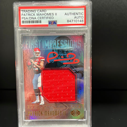 Patrick Mahomes II Autographed 2017 Panini First Impressions Rookie Patch Trading Card #FI-PM Authentic Auto PSA